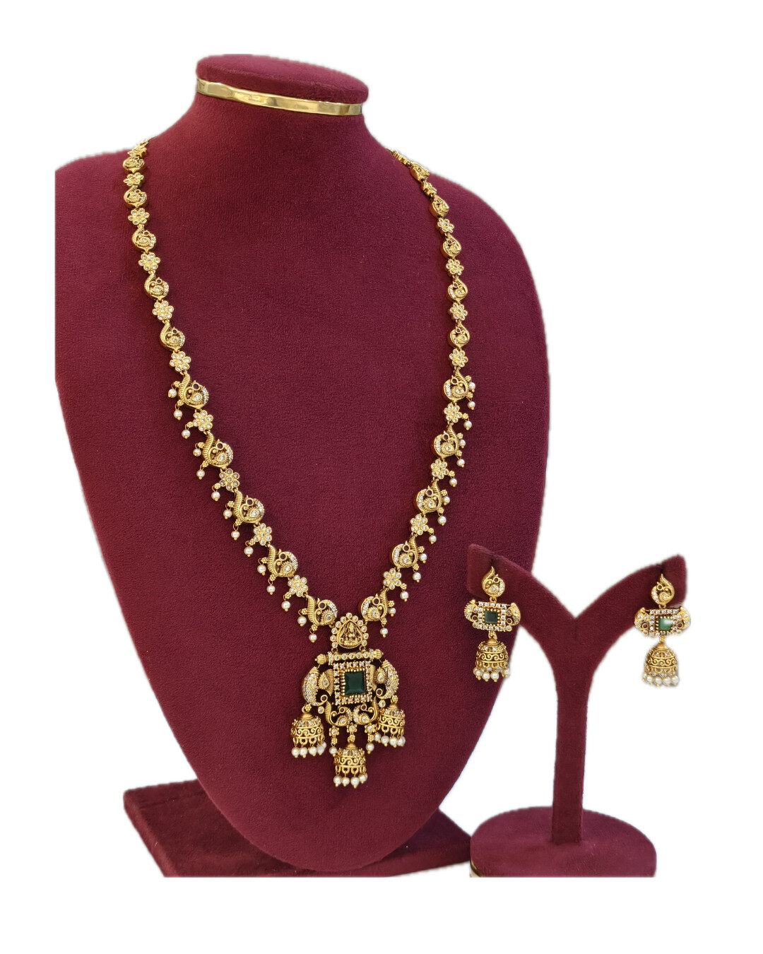 Embrace timeless elegance with this stunning traditional gold bridal necklace and earring set. Featuring intricate antique finish work, ornate temple-inspired pendants, and beautiful emerald green stone accents, this complete jewelry ensemble perfectly complements Indian bridal and festive occasions. The elaborate chain design with decorative coin motifs and matching jhumka earrings create a regal look that celebrates cultural heritage with contemporary appeal.